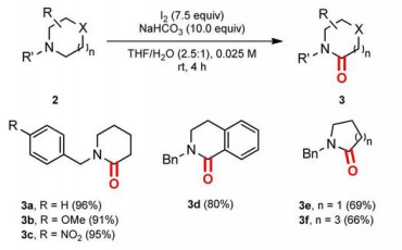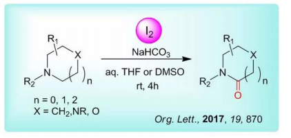 环胺的氧化是合成内酰胺的重要方法之一。一般该类反应需要用到昂贵或有毒的过渡金属如锇,汞和钌氧化物。本文介绍一种新方法(Org. Lett., 2017, 19, 870)使用碘作为氧化剂在室温下实现环胺向内酰胺的转化。该方法底物普适性非常广,不管是 N-烷基取代或其他取代的底物,以及带位阻的环胺都能获得内酰胺产物。环外的苄基,烷基和胺都不被氧化,环胺中带富电子或缺电子芳香环,双键和芳香杂环不受影响。 此外手性环胺在氧化过程中对映选择性能获得很好的保持。以下为发表文章中的一些氧化实例和反应可能的机理。